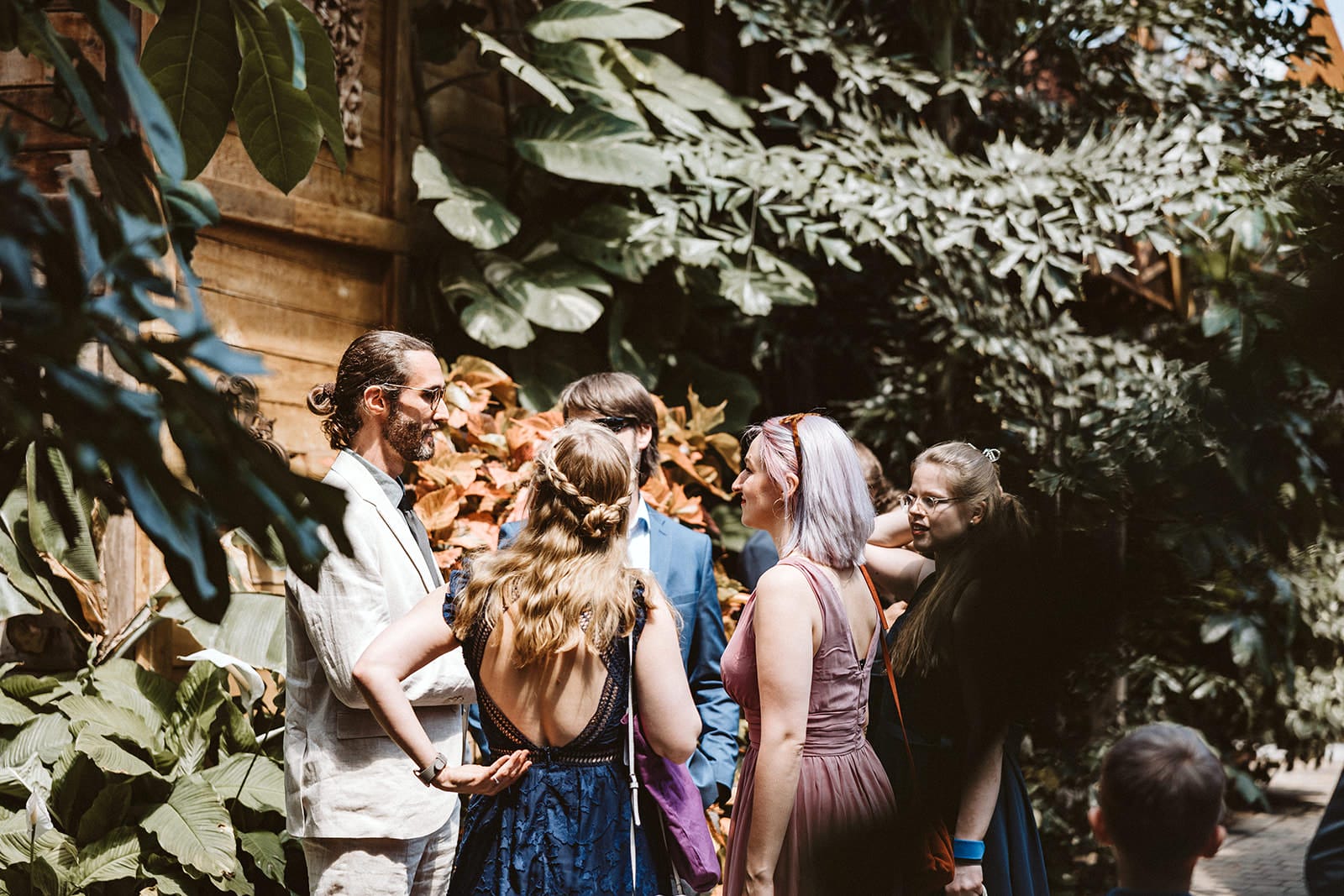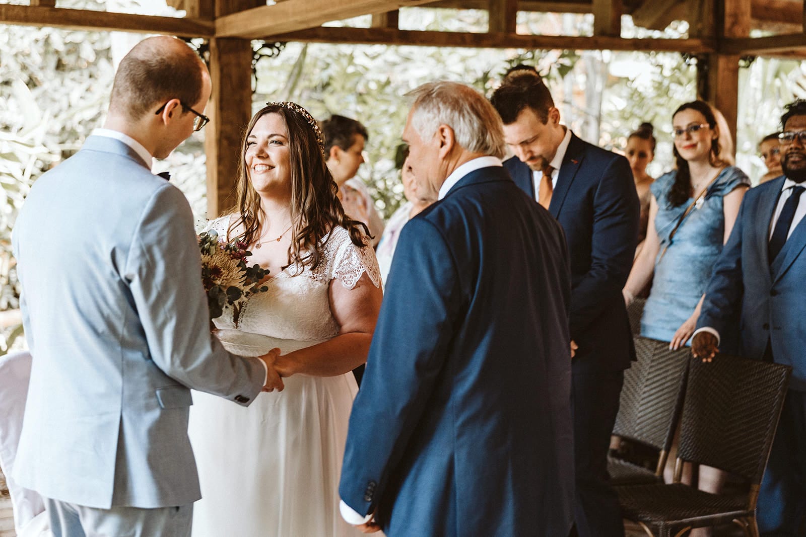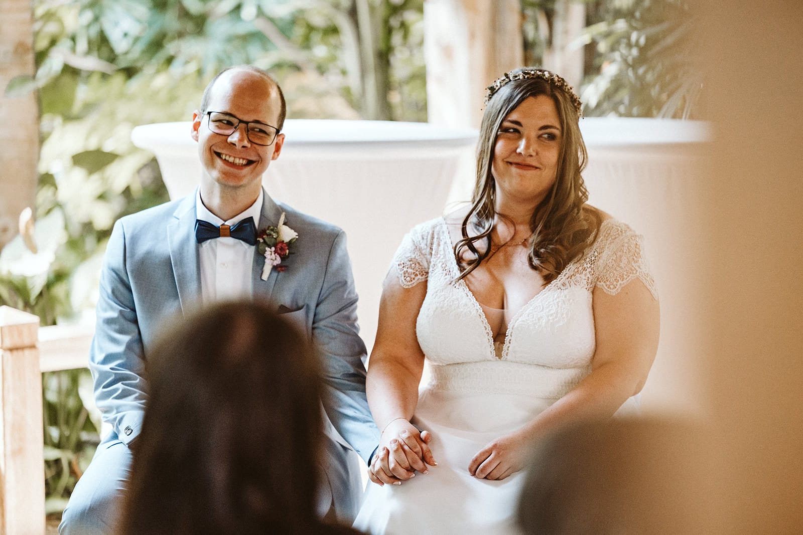Auch die Trauung fand im Tropenhaus statt. Das Ambiente ist hier sehr einzigartig und besonders. Die Akustik durch den abgeschirmten Pflanzen- und Flora-Raum außerordentlich gut. Ich habe mich fast wie im Urlaub gefühlt. Es gab auch eine Trauzeremonie, bei der die Hochzeitsgäste kleine Liebesbotschaften auf Holzklötzchen schreiben sollten. Während des Schreibens wurde ein Song gespielt. Eine tolle Erinnerung für die Ewigkeit.