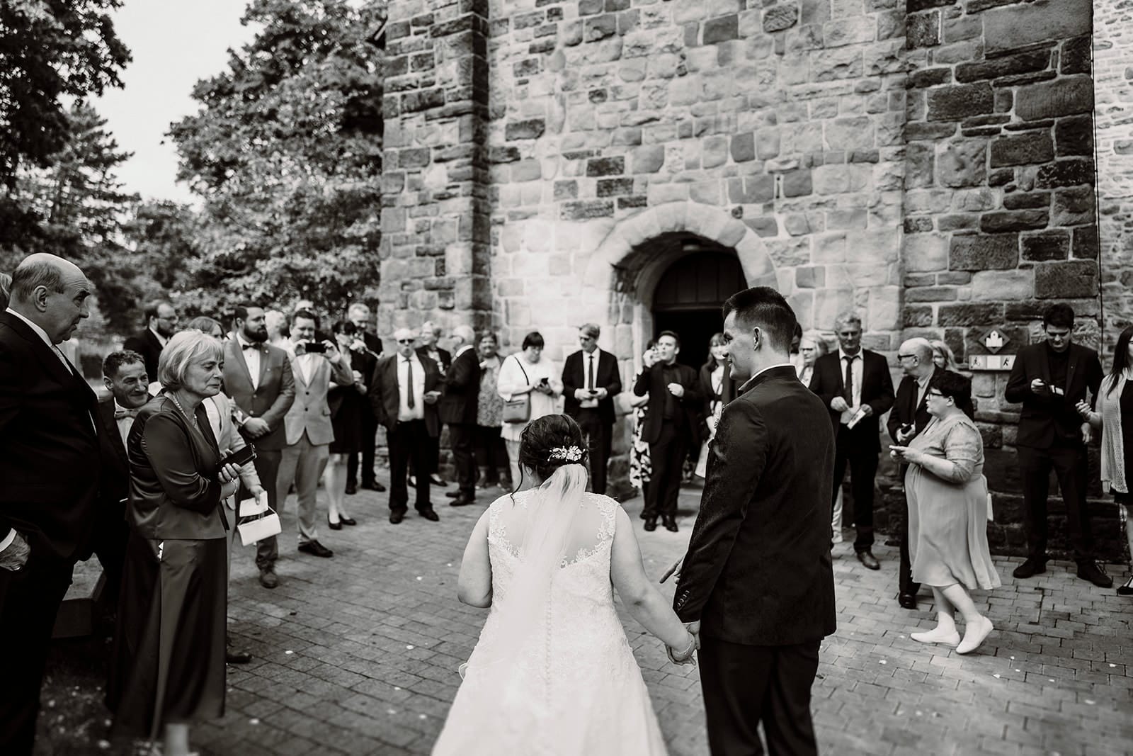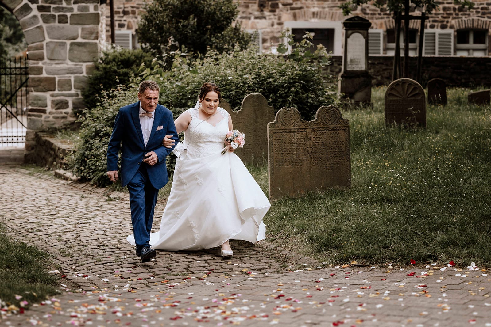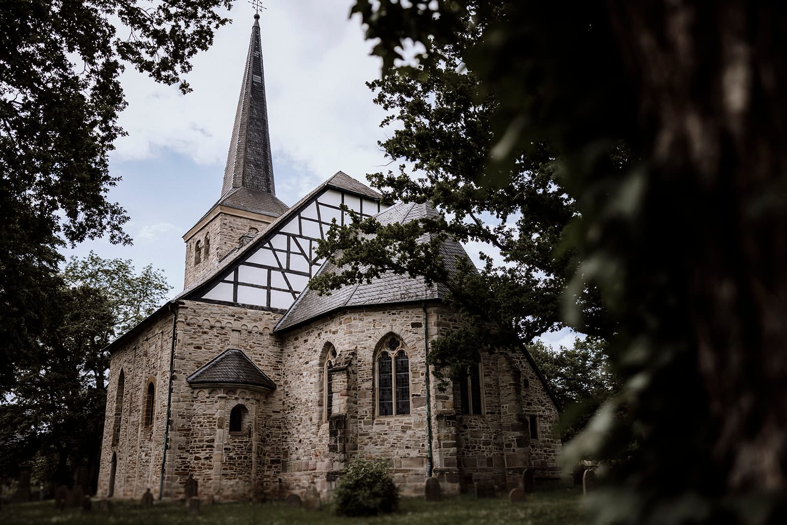 Die Trauung fand in der malerischen Stiepeler Dorfkirche in Bochum statt, einem der ältesten, gut erhaltenen Bauwerke der Stadt, bekannt für seine mittelalterlichen Wandmalereien. Begleitet von Sänger Michael Wurst, nutzte ich die stimmungsvolle Atmosphäre aus.