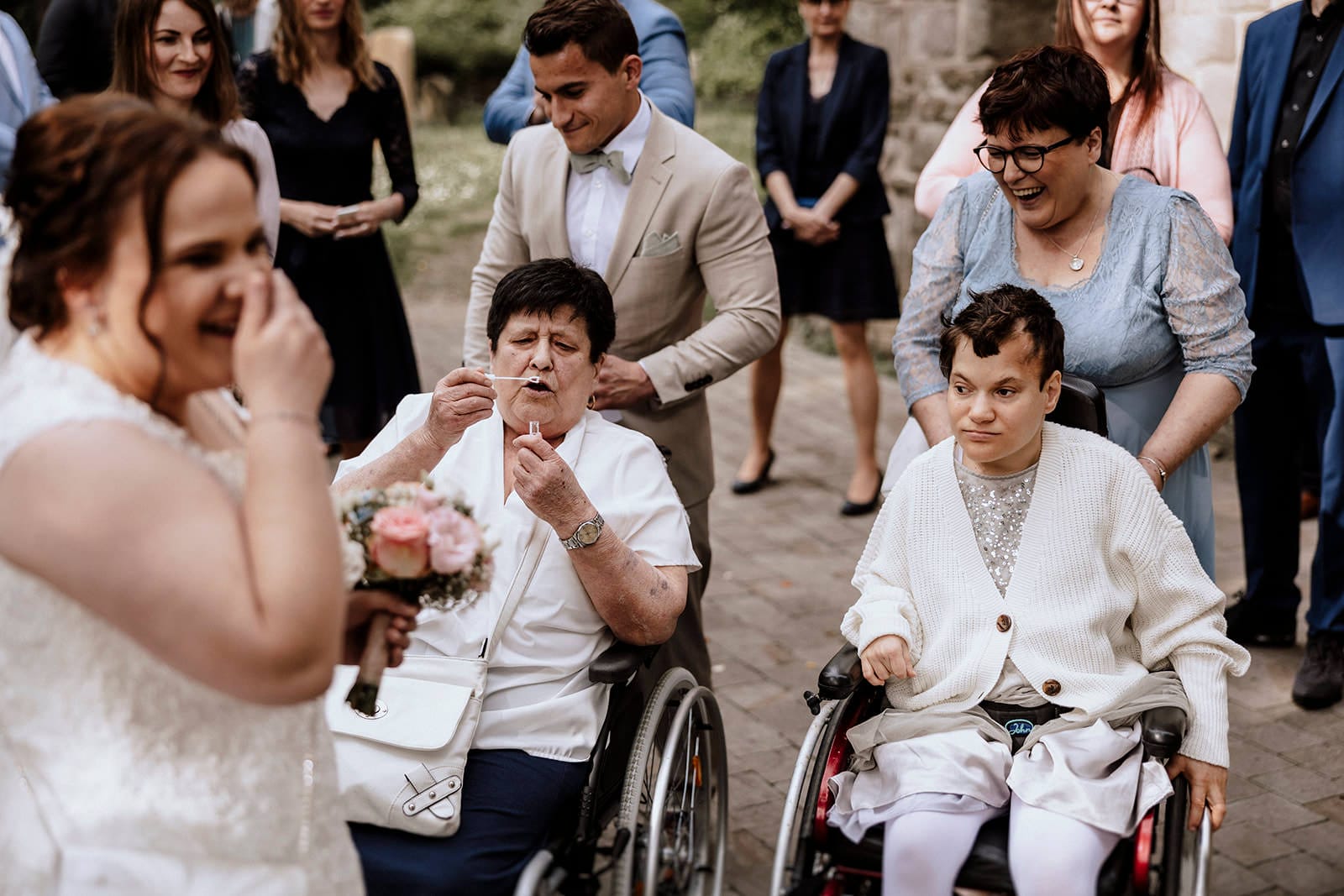 Ob Jung oder Alt – niemand lies es sich entgehen, das Brautpaar mit Seifenblasen zu empfangen und die herzlichsten Glückwünsche auszurichten. Die Hochzeitsgäste feierten Sabrina & René, weshalb auch ordentlich Tränen an dem Tag flossen – Freudentränen natürlich.