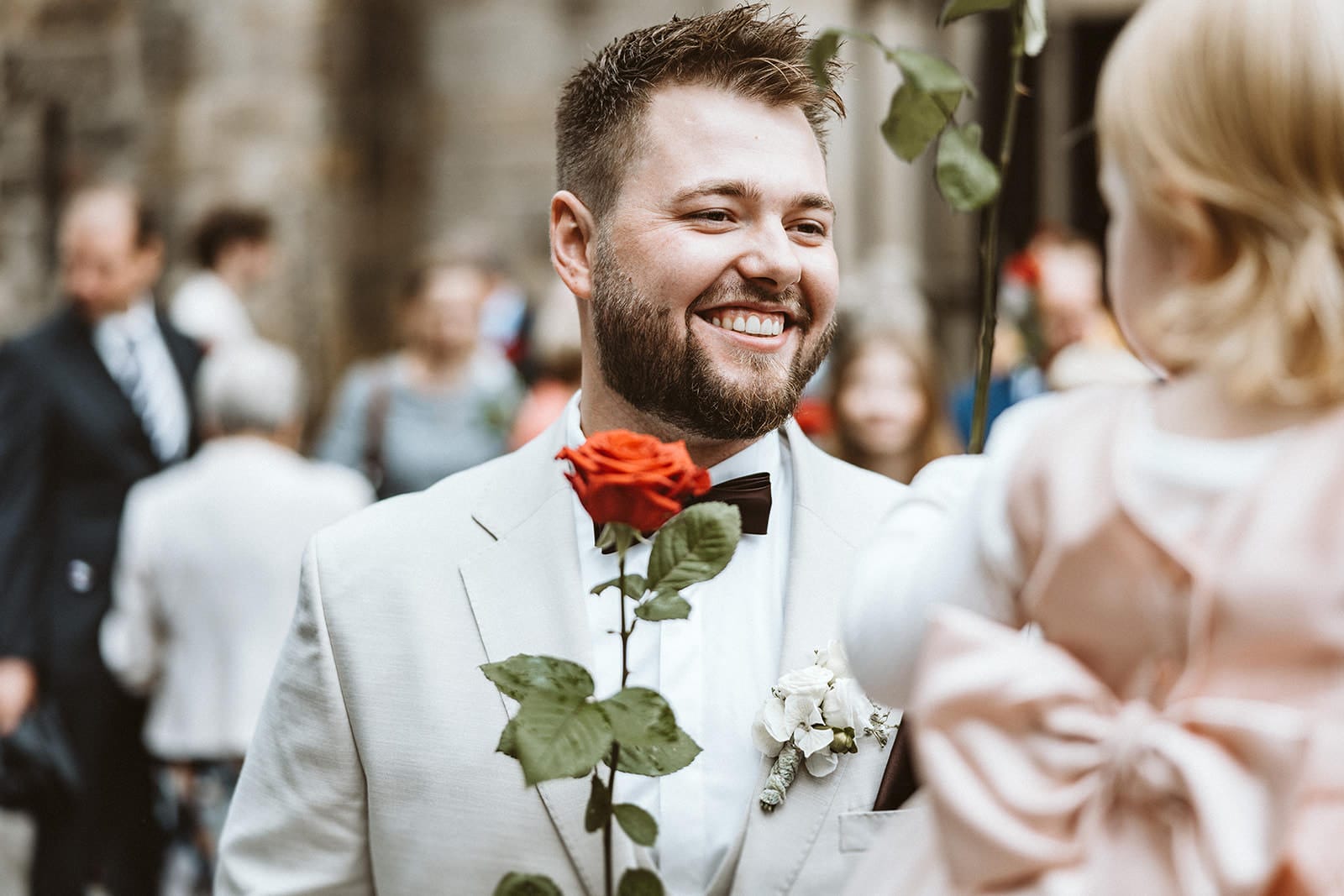 Der Empfang fand im “Trüffelschwein” in Hilden statt, wohin wir unter starkem Regen fuhren. Wir hatten bereits einen Plan B, aber dank einer Wetter-App konnten wir dennoch einige Outdoor-Aufnahmen machen.