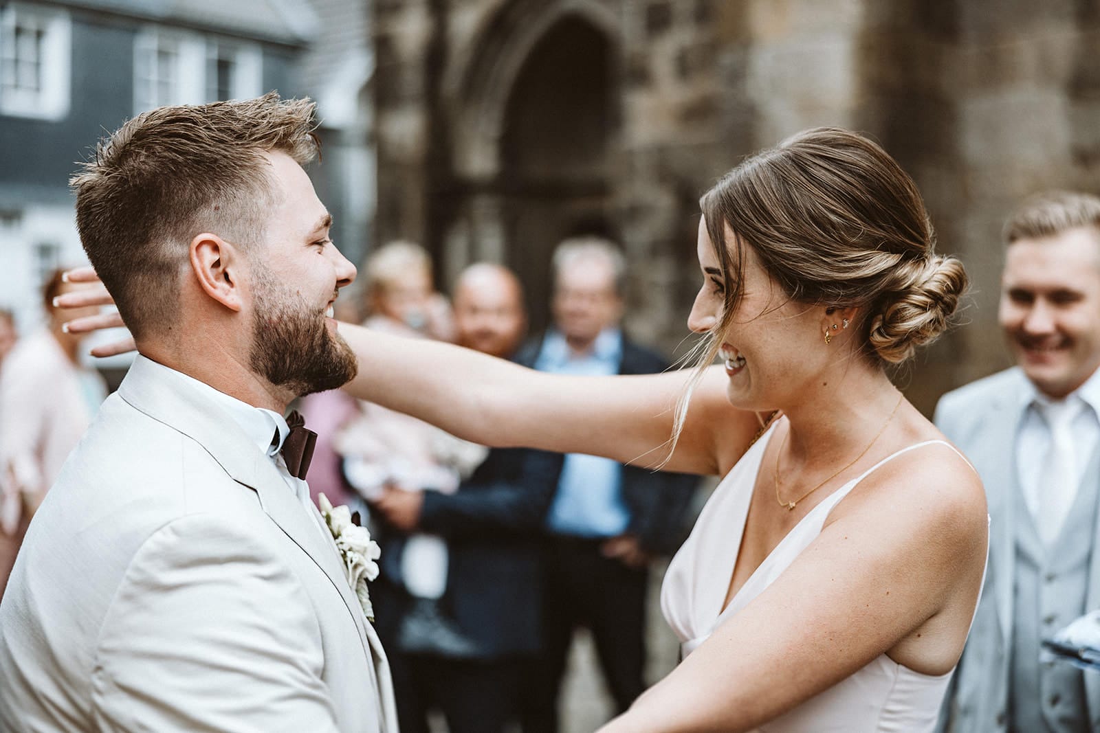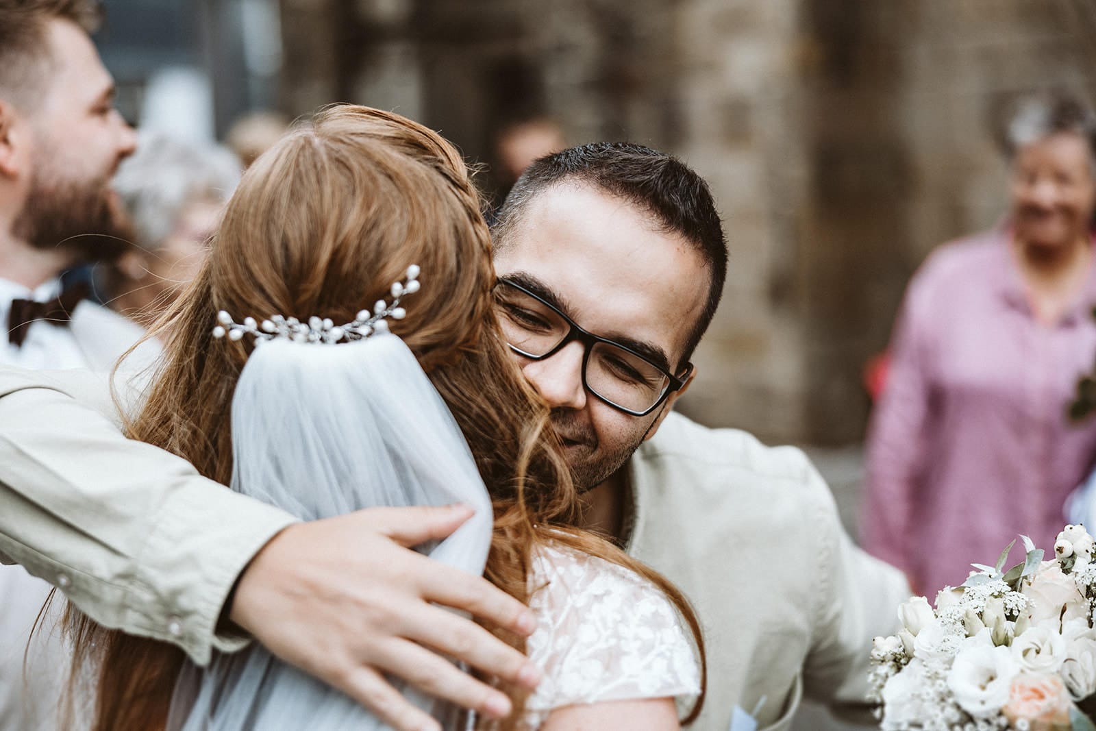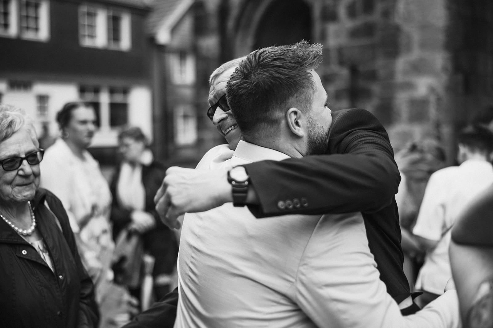 Nach der Trauung wurde sich kräftig gedrückt. Wir hatten Glück, denn zu diesem Zeitpunkt war das Wetter stabil und es regnete nicht. Somit bleiben auch die wunderschön angekleideten Hochzeitsgäste vor Nässe geschützt.