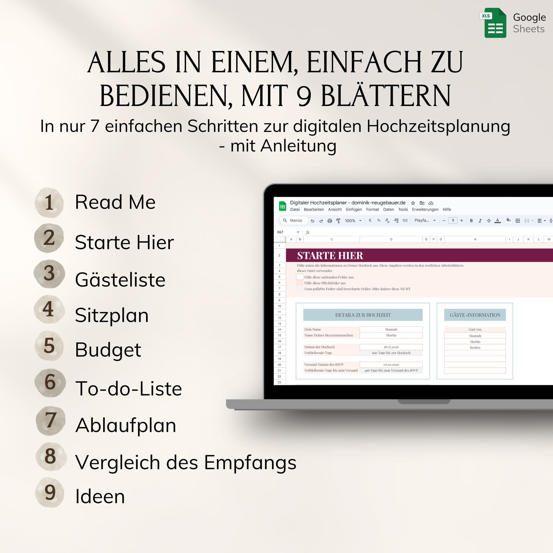 Deine Hochzeitsplanung kann ganz schön unübersichtlich werden. Gut zu wissen, dass Du hier alles an einem Ort hast – kompakt und digital, immer greifbar auf 9 Tabellenblättern.