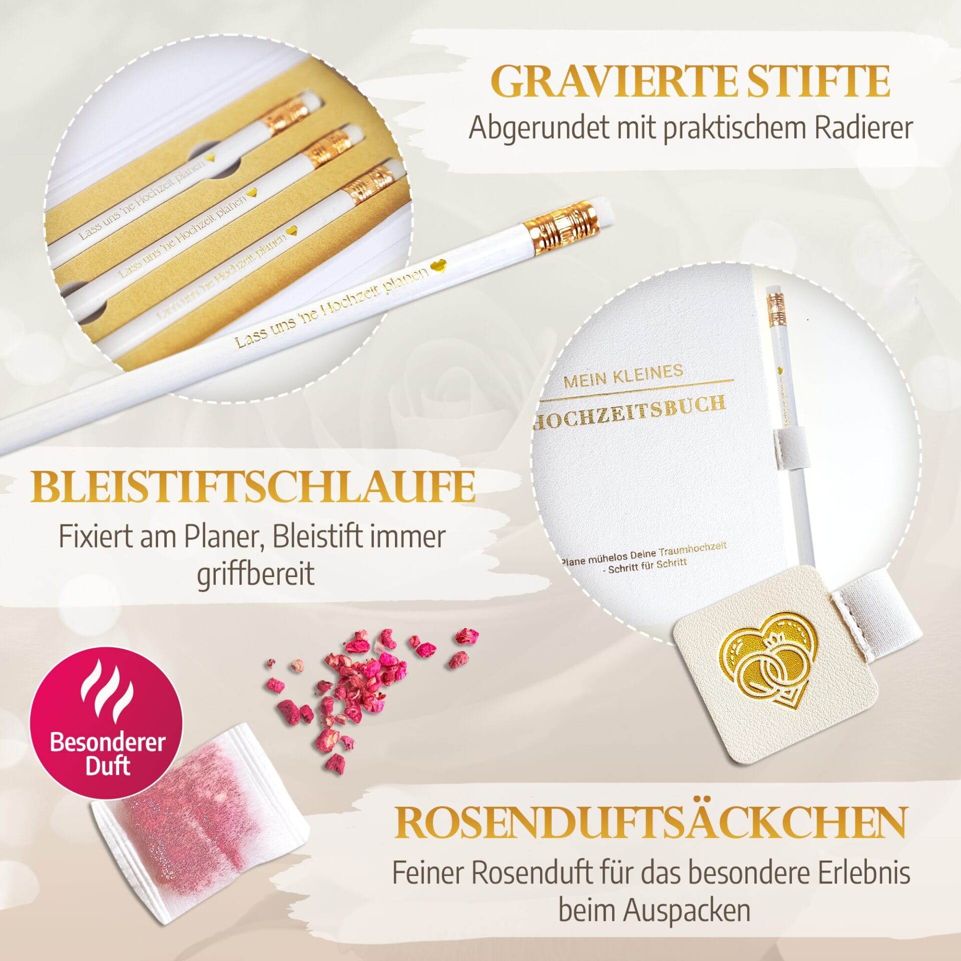„Mein kleines Hochzeitsbuch” eignet sich auch perfekt zum Verschenken – zum Beispiel als Trauzeugin, Freundin und Teil der Brautfamilie. Warum? Weil es den Planer immer im Geschenke-Set gibt, mit Bonus-AddOns und Zubehör. So kann die Hochzeitsplanung sofort starten! Das Set enthält …